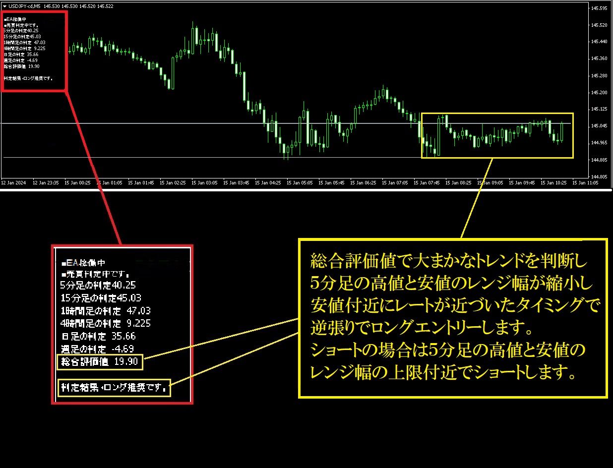 TokyoTrend_USDJPY(東京トレンドUSDJPY)は、1分足から4時間足で動作するMT4専用のEA自動売買システムです。 マルチタイムフレーム分析を使用した独自の採点評価に基づき大まかなトレンドを判断します。 日足週足のトレンドに対しては順張り方向でエントリーしますが、日本時間の早朝~夕方17:59までの時間は短期間の時間足(5分足チャート)に対して逆張りで仕掛けます。