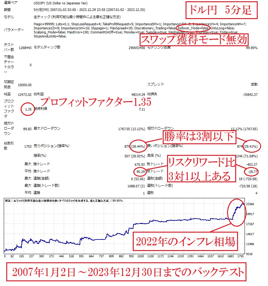 ドル円5分足チャートでのバックテスト結果(スワップ獲得モード無効)