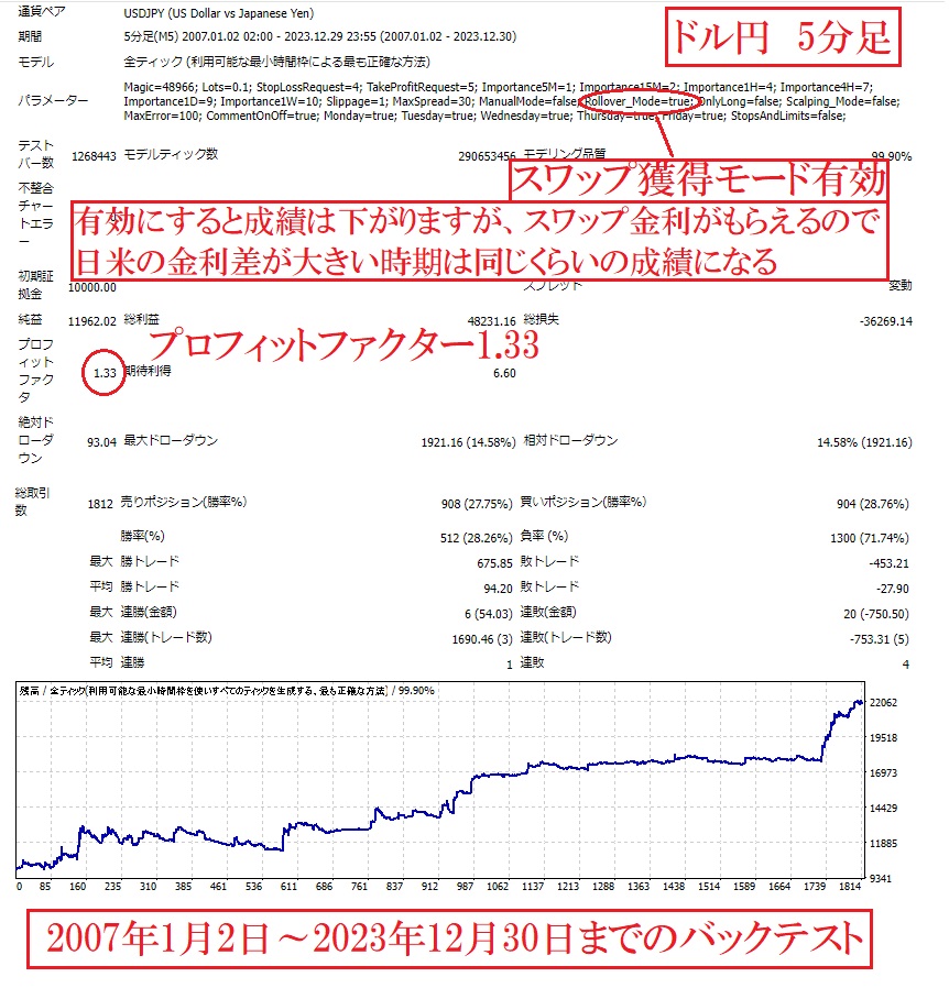 ドル円5分足チャートでのバックテスト結果(スワップ獲得モード有効)