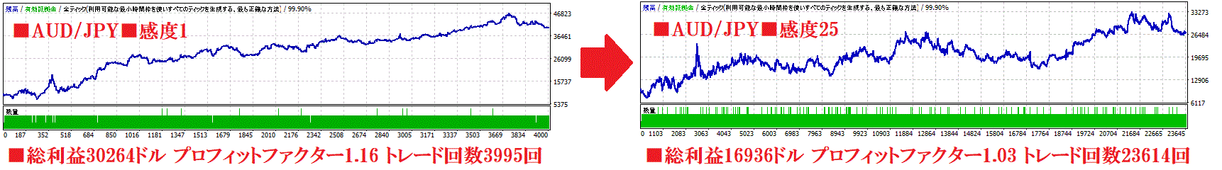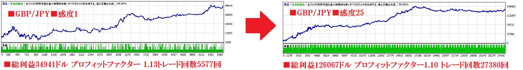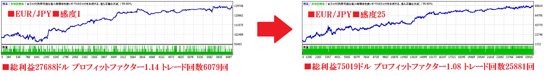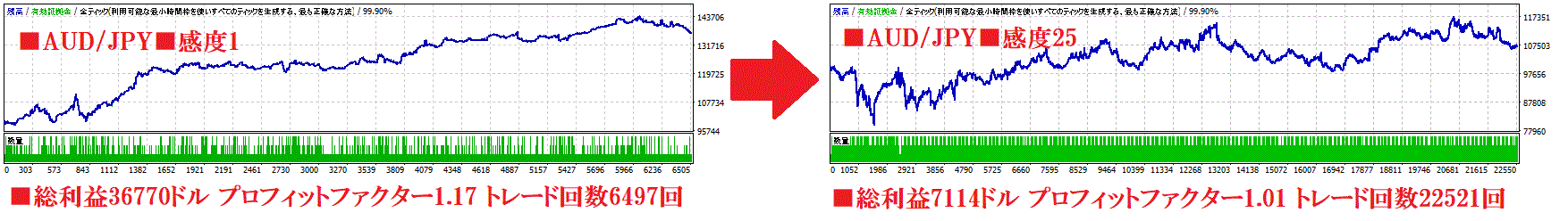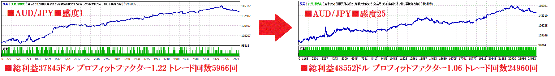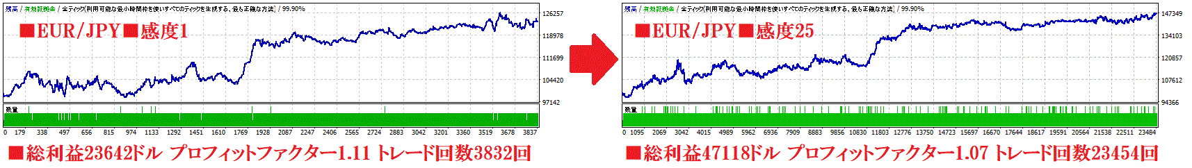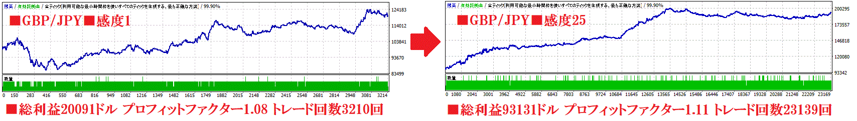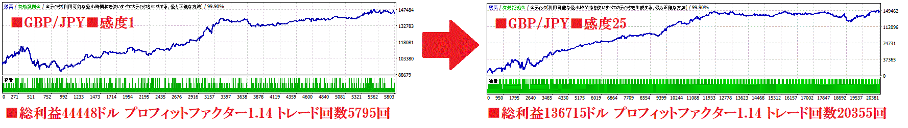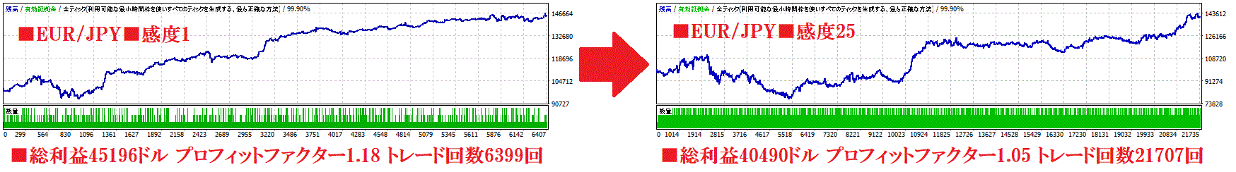 したがって、高ボラティリティ相場は感度をMAXの25に、値動きの穏やかな時期は感度を下げると成績が安定します。