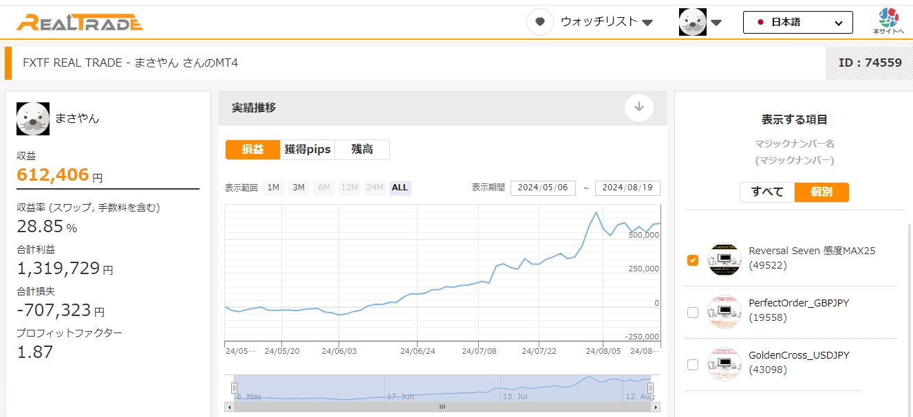 お知らせ(2024年8月20日) 現在、Reversal Sevenのゴゴジャン公式フォワードでは、大きめのドローダウンが発生しております。 逆張りのEAにとって現在の相場との相性が最悪で、デフォルト設定の感度1では勝てません。 Ver1.02で追加した感度の設定を行うことで、あらゆる相場に対し利益が狙えます。 FXTFのリアル口座では、ゴゴジャン公式フォワードとは真逆の成績になっています。