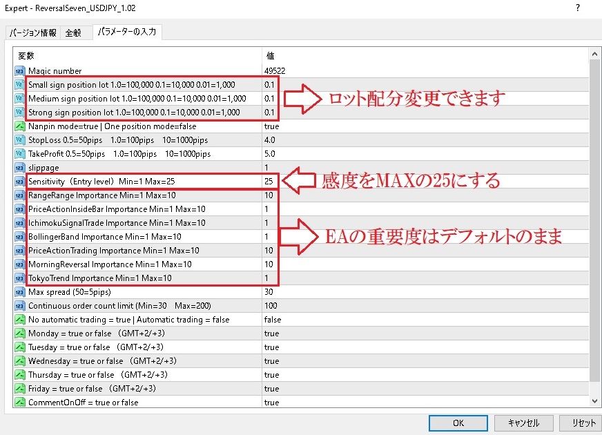 つまり、EA制作者によるバージョンアップを待たなくても、EAの重要度を変更するだけで、現在の相場に合わせて自由自在にEAをカスタマイズできるということを意味します。