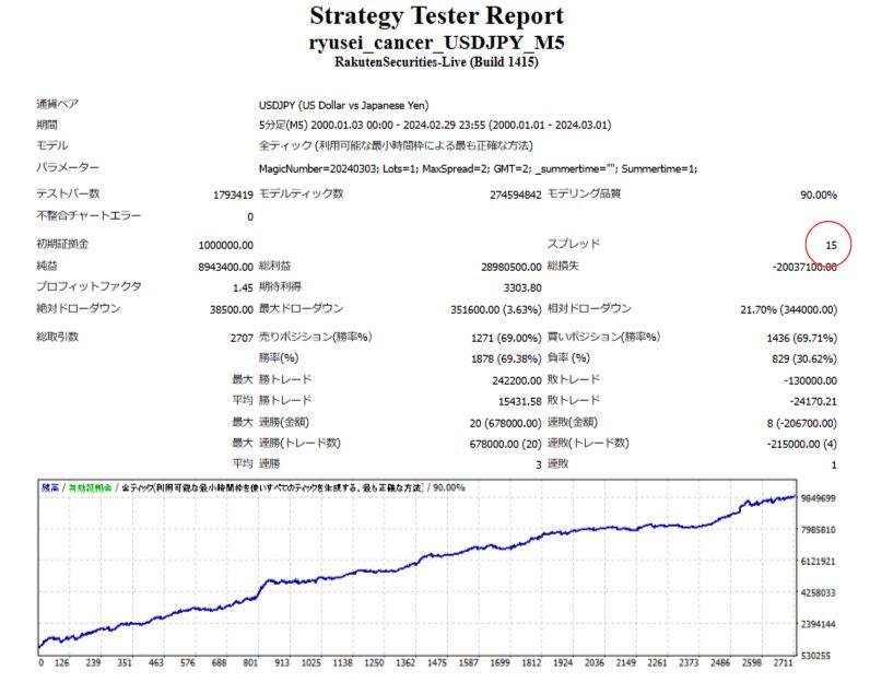 20 年以上の長期バックテスト、プロフィットファクター (PF) 1.45、適切なスプレッド 15。