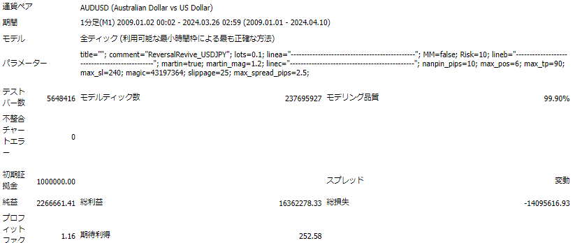 ①20年以上のバックテストで右肩上がりである 20年に渡る長期間のバックテストと信頼性の高いティックデータで支持された右肩上がりの成績は、当EAの優れた特徴の一つです。 このシステムは市場の変動に対する堅牢性を示し、その信頼性は確かな利益をもたらします。 ②ナンピン、マーチンゲールを採用しながらドローダウン値が低水準である ドローダウン値が低水準であることも重要なポイントです。 ナンピンとマーチンゲールのロジックを採用しながら、徹底したリスク管理により安定したトレード環境を提供します。 ③買いと売りが同一のロジックである 買いと売りが同一のロジックであるため、長期足のトレンドに左右されず取引の一貫性と信頼性を期待できます。 ④他通貨で使用しても一定の利益が見込める USD/JPY通貨ペアに限らず、他の通貨ペアでも一定のパフォーマンスを発揮します。 その堅牢な取引ロジックと信頼性の高さは、相場共通の普遍的な値動きを捉えており、複数の通貨ペアで一定の利益を実現しました。 ⑤最大1ポジションに設定しても一定の利益が見込める 最大1ポジションに設定しても利益が出ることが証明されています。 1ポジションでも利益が出るということは、エントリーロジックが優れたものであることの証明です。 精密に練られたエントリーシグナルを活用し、1ポジションでの収益を実現しています。 市場の動きを的確に捉え、安定的な利益をもたらすことが示されています。 他通貨ペアでのバックテスト