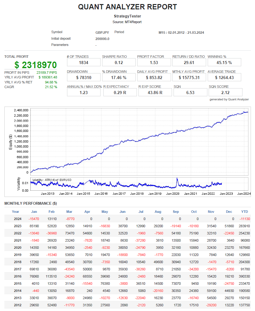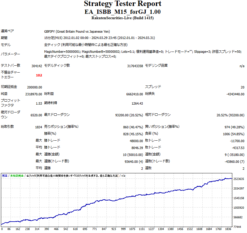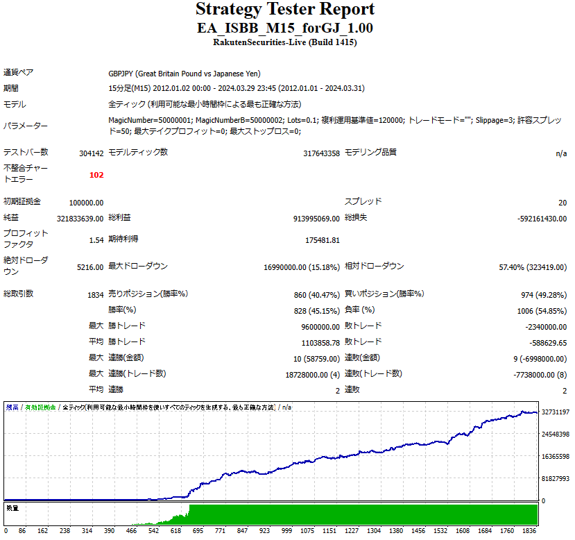 1万通貨のトレードで、2012/01/01~2024/03/30で実施したテスト結果は以下です。