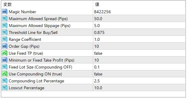 - OrderGapPips:新しい注文を出す際の価格間隔をPipsで設定