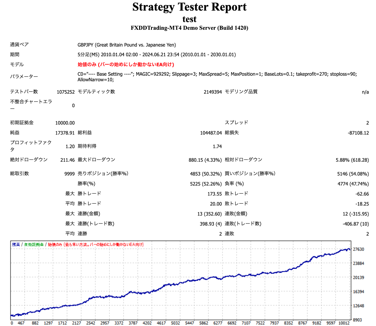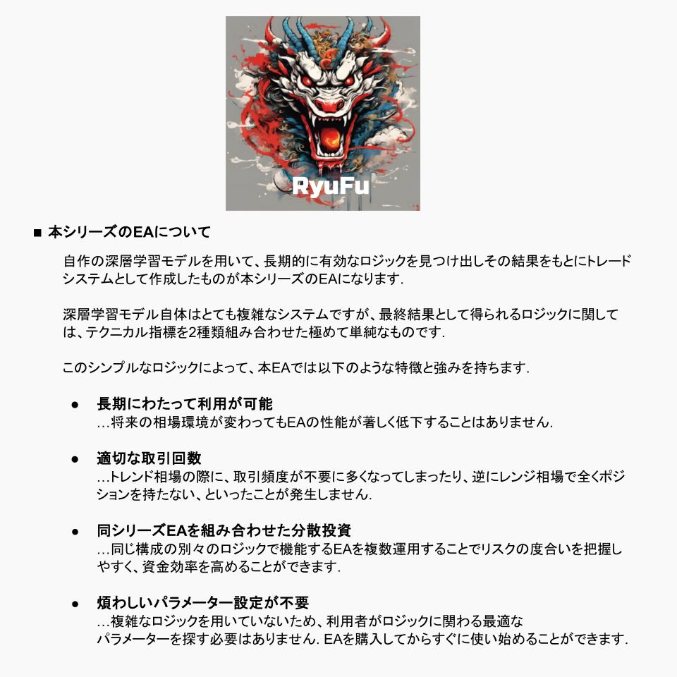 システム概要 [特徴] - 買いと売り両方に対応したトレンドフォロー型のEA. - 同時に建てるポジションは一つで、保有ポジションが決済されるまで次のポジションは建てない. - 極端な最適を行わないことで、長期的に利益を伸ばせるように設計. - 決済逆指値(S/L)を90pips、決済指値(T/P)を270pipsとした、損小利大トレード. [エントリ基準] 1 かつ 2の条件を満たすとき - 1. ボリンジャーバンドブレイク - 2. 3本移動平均線のパーフェクトオーダー [エグジット基準] 1 または 2の条件を満たすとき - 1. エントリ基準の逆向時 - 2. 設定された決済逆指値(S/L)、決済指値(T/P)に達した時 パラメーター設定 MAGIC マジックナンバーです。他のEAと区別するためにユニークな数値を設定してください。 Slippage 新規ポジションを注文する際に注文価格と約定価格の差(スリッページ)をどの程度許容するかを設定します。許容範囲を超えた場合、注文は約定されません。 Spreads 新規ポジションを注文する際に売り価格(BID)と買い価格(ASK)の差(スプレッド)をどの程度許容するかを設定します。許容範囲を超えた場合、注文は行われません。 MaxPosition 最大保有ポジション数。このEAに関しては1ポジションしか持たないため、特段設定は必要ありません。 BaseLots ポジションのロット数を指定します。 takeprofit 利幅をポイントで指定します。指定した値がそのまま決済指値(T/P)に設定されます。 stoploss 損切り幅をポイントで指定します。指定した値がそのまま決済逆指値(S/L)に設定されます。