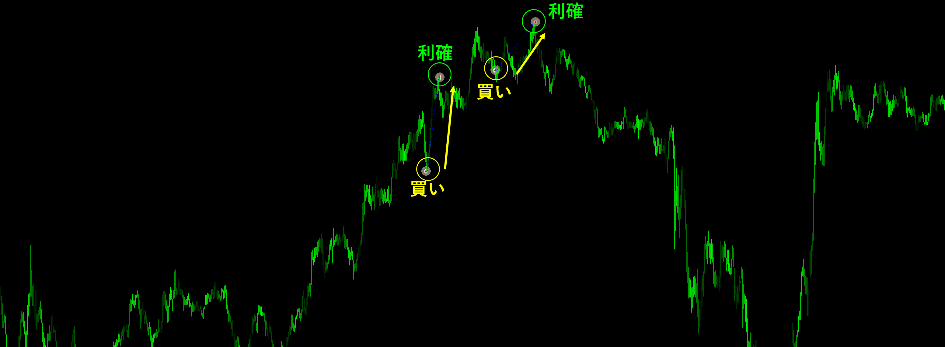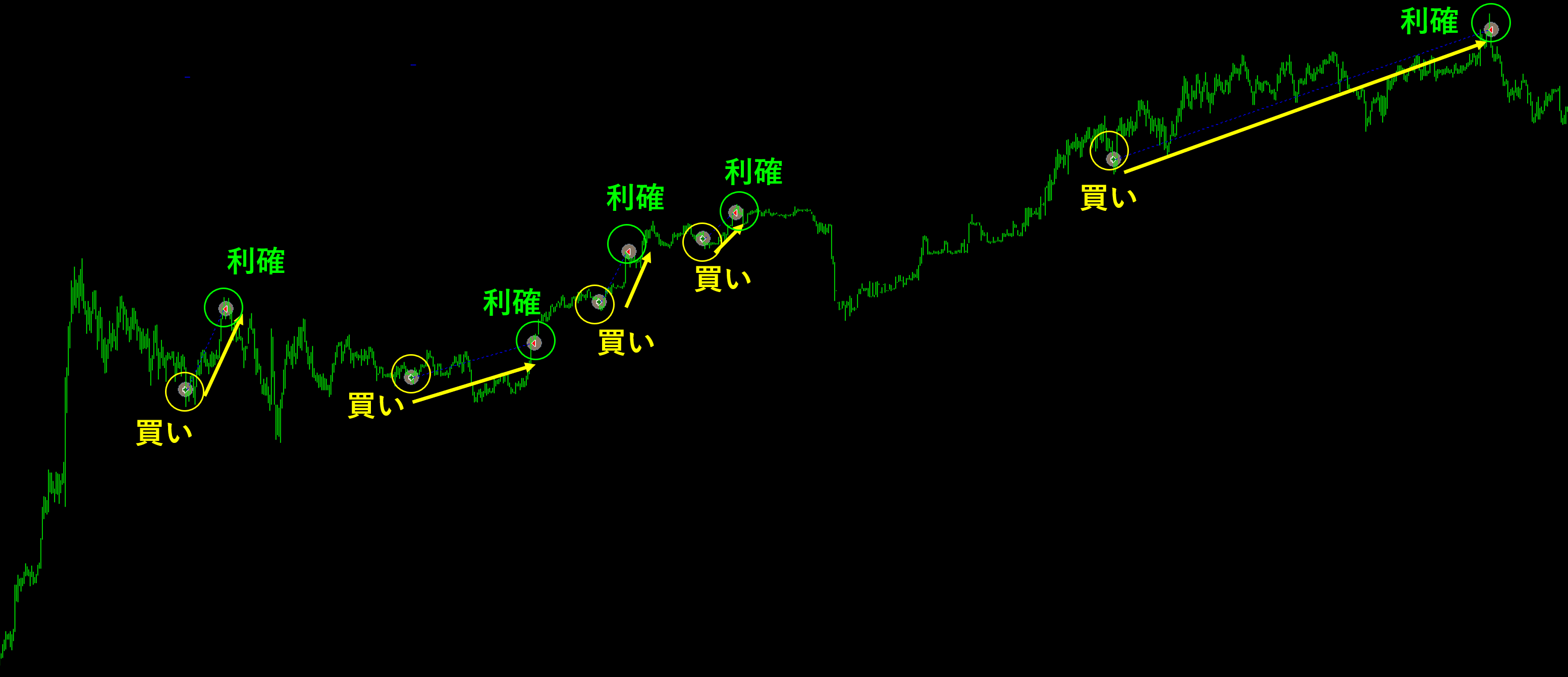 広い視野でトレンドを見極め、大きく利益を取ろうとせず、安全なタイミングで回数を重ねて利益を積み重ねます。