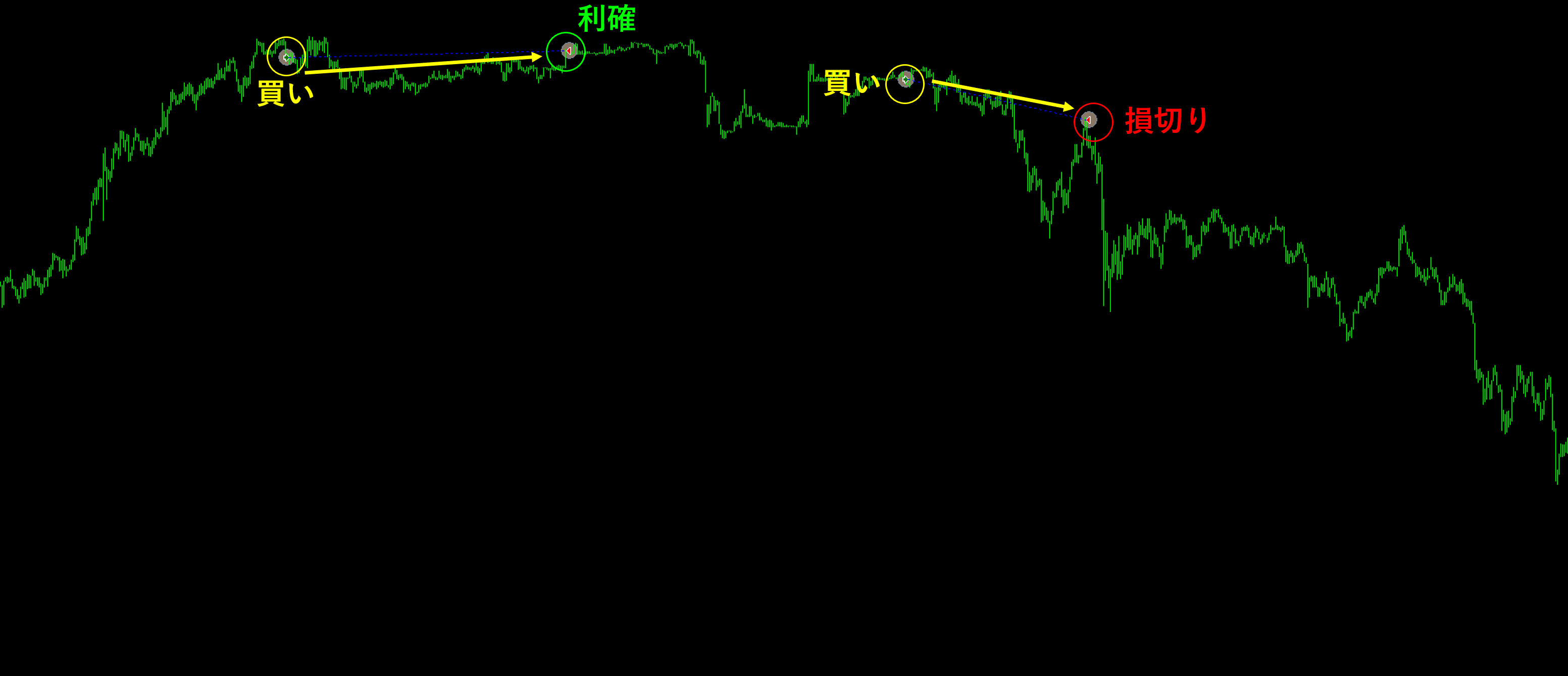 下降トレンド中は自ずとポジション取得タイミングが減りますが、その分、上昇トレンド中はポジションを積極的に取っていきます。