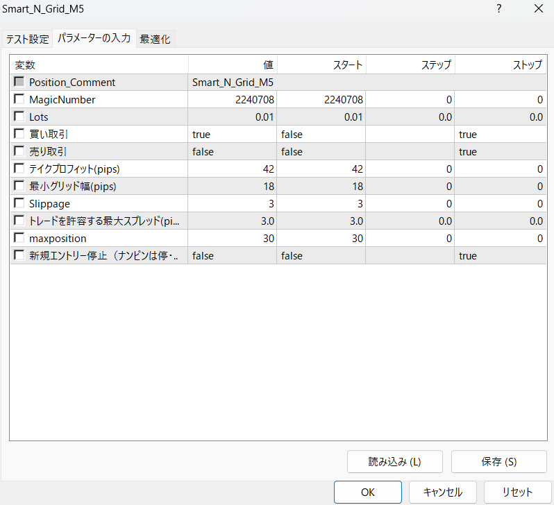 クロス円やドルストレートに使用できますが、テイクプロフィットや最小グリッド幅などの調整が必要です。