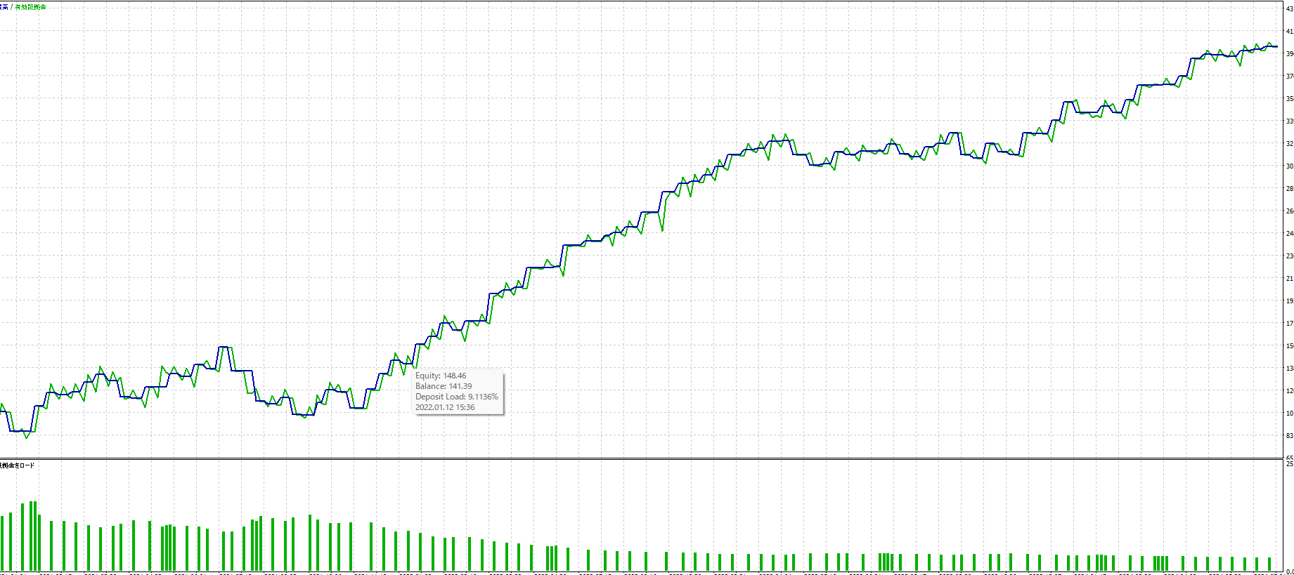 - グラフから見て取れるように、このEAは長期間にわたり安定した利益を生み出しています。曲線が一貫して上昇しており、信頼性の高いパフォーマンスを示しています。