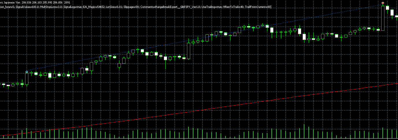 このエキスパートアドバイザー(EA)は、GBPJPY通貨ペアに特化したトレーディング戦略を実装しています。指定した時間内の高値と安値を計算し、そのレンジをブレイクアウトする際にトレードを行います。レンジが狭い場合にブレイクアウトのシグナルを検出し、その方向にトレードを行います。また、トレーディングのリスク管理のためにトレーリングストップを使用し、利益を最大化します。
