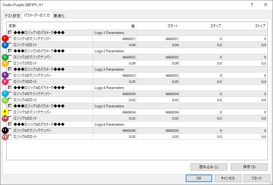 ⑫ロジック6のロットを設定します。初期値は各ロジック間の補完の効果を最大限生かすように設定しています。