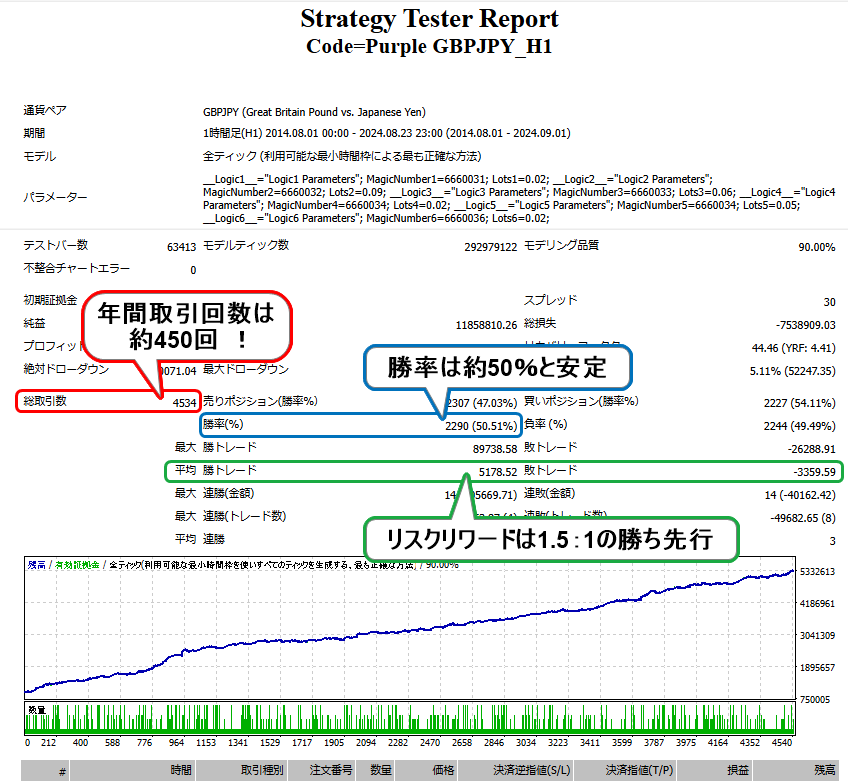 勝率は約50%、リスクリワード1.5:1、年間取引450回超の安定した取引