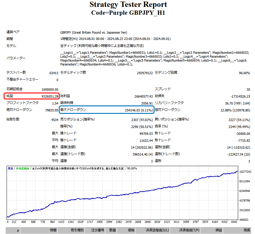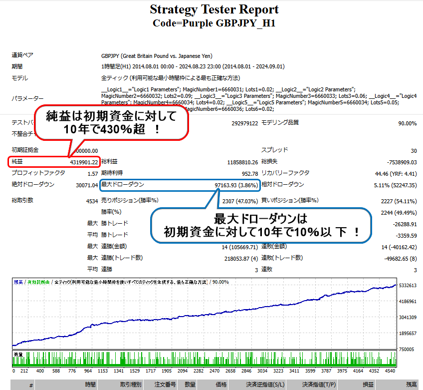 Code=Purpleに採用されているすべてのロジックは2014年8月から2024年8月末までの10年間で100万円、0.1ロットで運用した際に最大DDが10%以下になるように設計されています。 これは一つのEAとして稼働させるときに損失が大きくなり過ぎないように6ロジック全体で初期資金の10%以下になるようにロットを調整(ほとんどが0.01ロット設定)しています。 しかしすべてのロジックはもともと0.1ロットを基準に個別に製作されたものでひとつひとつのEAとしても稼働が可能なものです。 そこですべてのロットを0.1に戻し全ロジックを通常運転してみるとその「リターン率は900%を超える」結果となります。