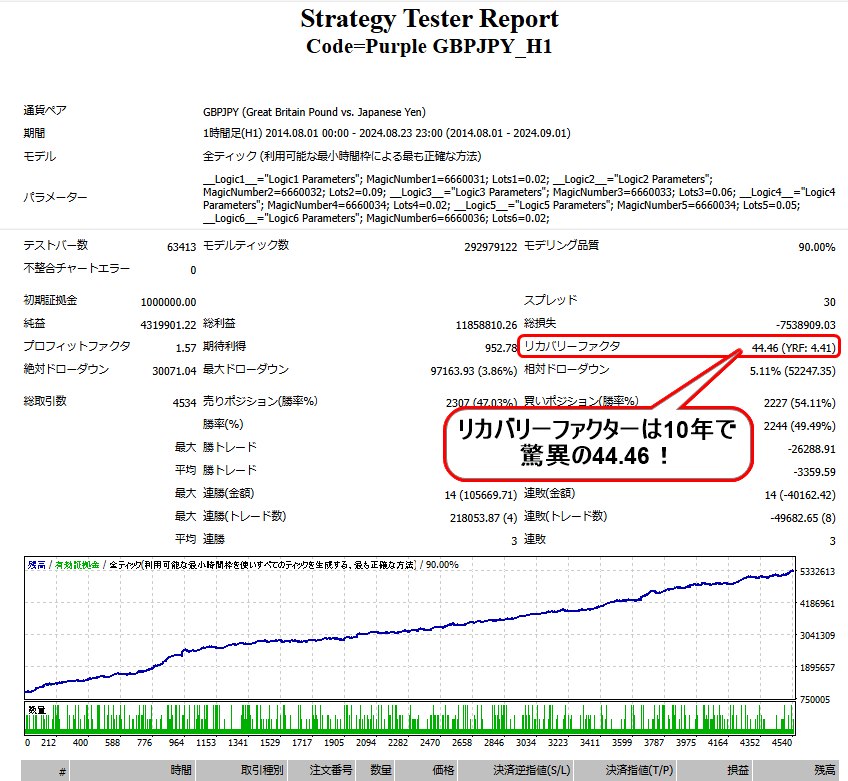 Code=Purpleの特徴のひとつに圧倒的なリカバリーファクターの高さがあります。 リカバリーファクターとは「ドローダウンを受けた時に元に戻るまでのリカバリー力(りょく)」のことを言います。 EAには必ずドローダウン期が訪れます。 しかしリカバリーファクターが高ければドローダウンを受けても資金回復の速度が早いので、稼働を止めてしまいたくなるような不安が少なくなります。 Code=Purpleのリカバリーファクターは10年間で「44.46」、過去10年間の平均値では「4.41」となっており、圧倒的なドローダウンからの回復力を誇ります。