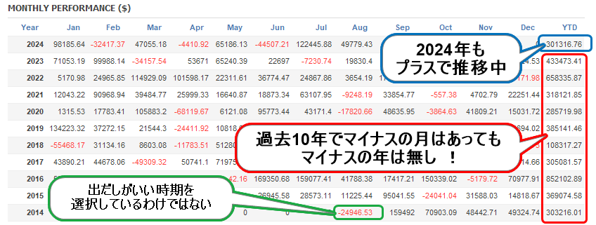 EAのバックテストの落とし穴として「長期バックテストの中にマイナスになる年が含まれている」ことがあることです。 長い期間のバックテストだとしてもその期間の中で1年や2年の損益がマイナスになっていることがあります。 長期運用で考えている場合は問題ありませんが、もしそのマイナスの時期が初年度に来た場合EAを使い続けることに疑問を感じてしまいます。 Code=Platinumは10年間のバックテストで各月ごとにマイナスになることはあっても年単位でマイナスになった年はありません。 これは毎年コンスタントに資金を増やせたテスト結果であり、稼働初年度から利益を得ることができる可能性が高いことを意味します。