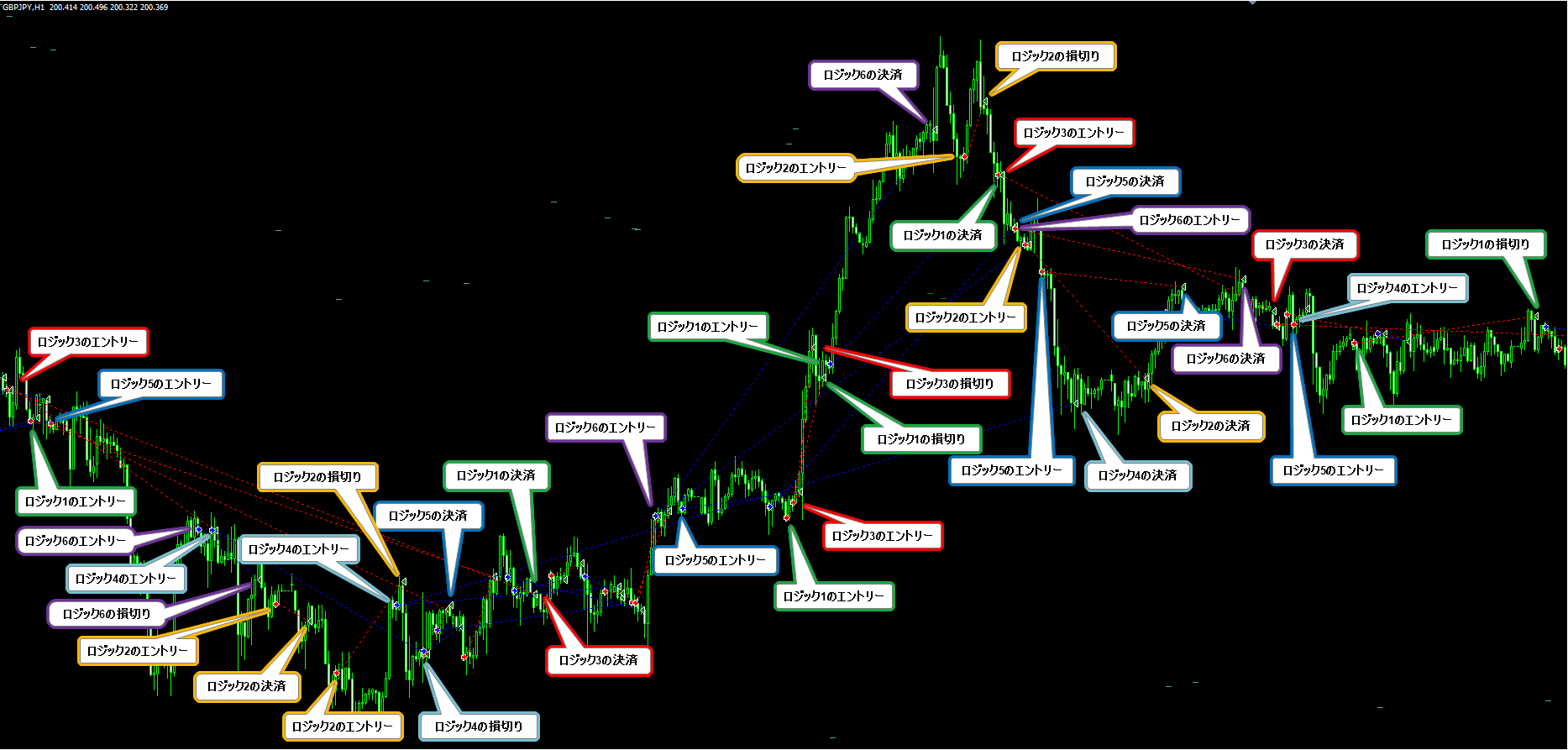 6つのロジックがそれぞれ個別にチャートを分析し、独立してエントリーと決済を行う