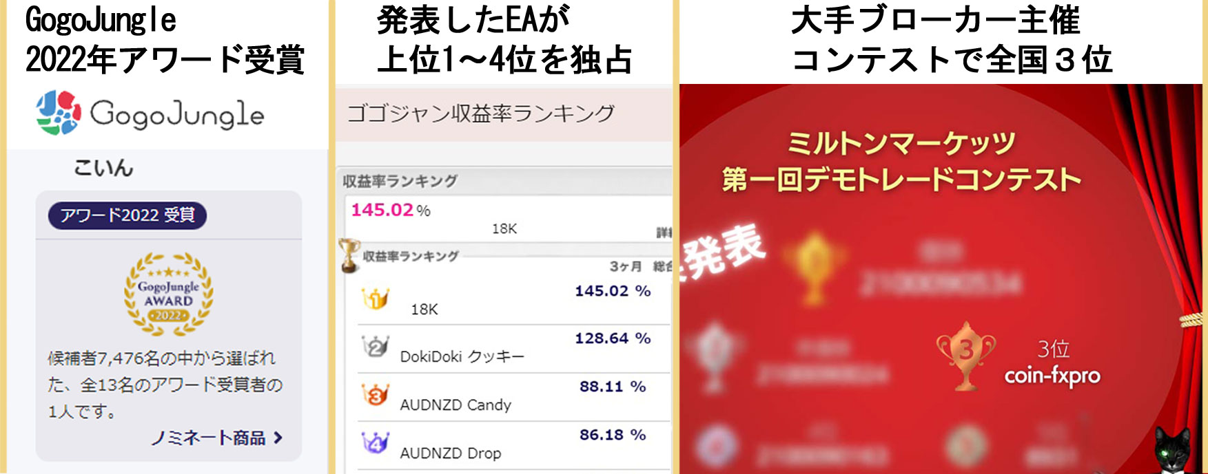 GogoJungle2022年アワード受賞 GogoJungleにて発表したEAが収益率で上位1~4位を独占 大手ブローカー主催コンテストで全国3位