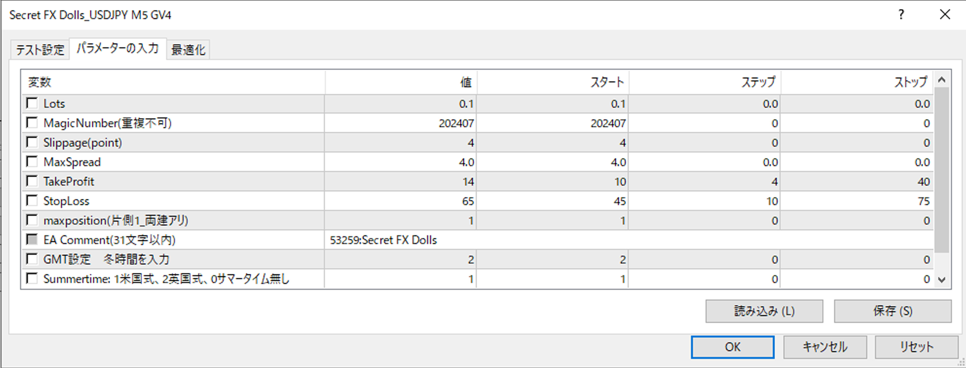 ◆Lots:初期値は0.1です。16年7か月のバックテストでの最大ドローダウンは271.5ドルです。