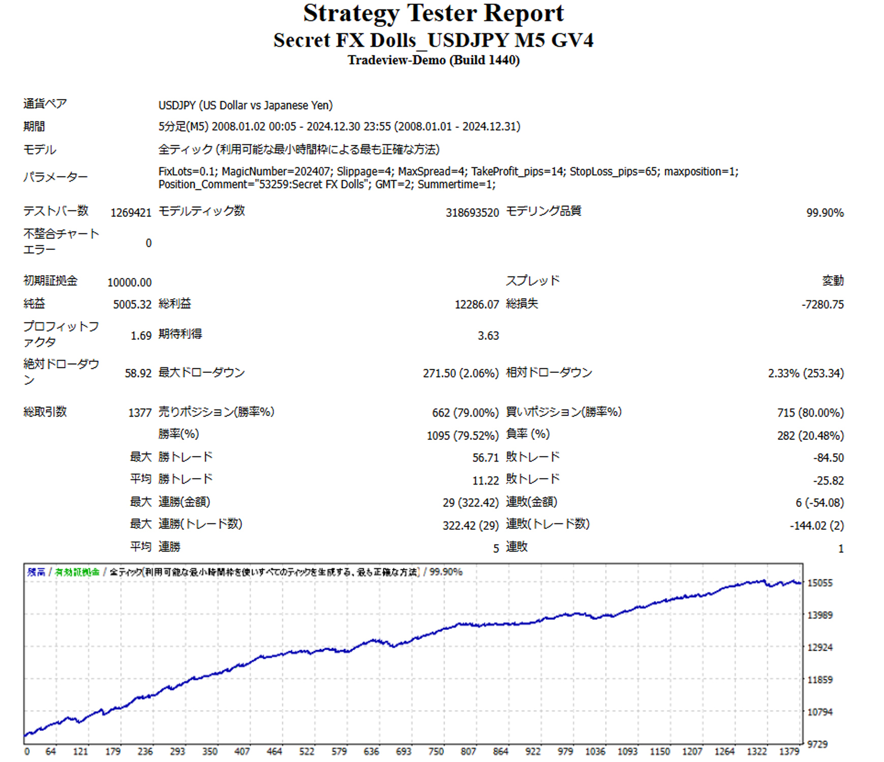 ◆期間:2008年1月1日~2024年8月2日(期間は2008年のリーマンショックを含む16年7か月) ◆モデリング品質:99%(世界最高水準の品質) ◆使用データ:TDS(Tick Data Suite) ◆スプレッド:変動(現状、最高に厳しいバックテスト) ◆レバレッジ:25 ◆ロット:0.1ロット ◆純益:5005.32ドル ◆最大ドローダウン:271.50 (2.06%) ◆プロフィットファクター:1.69 ◆リカバリーファクター:18.43 ◆総取引数:1377回(年に約83回、月に約7回)