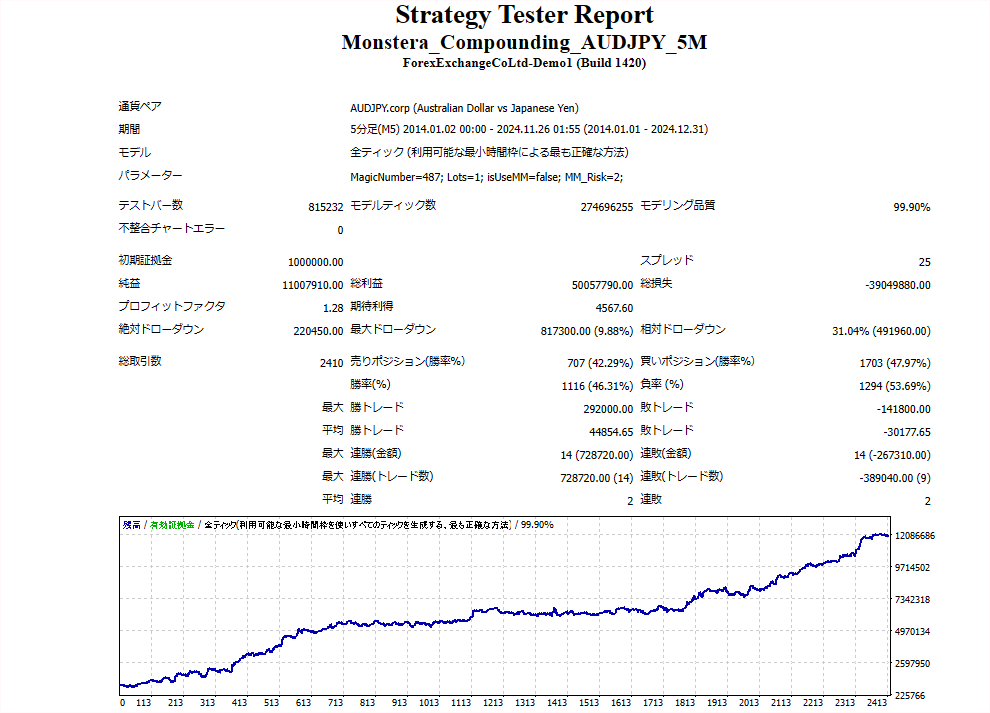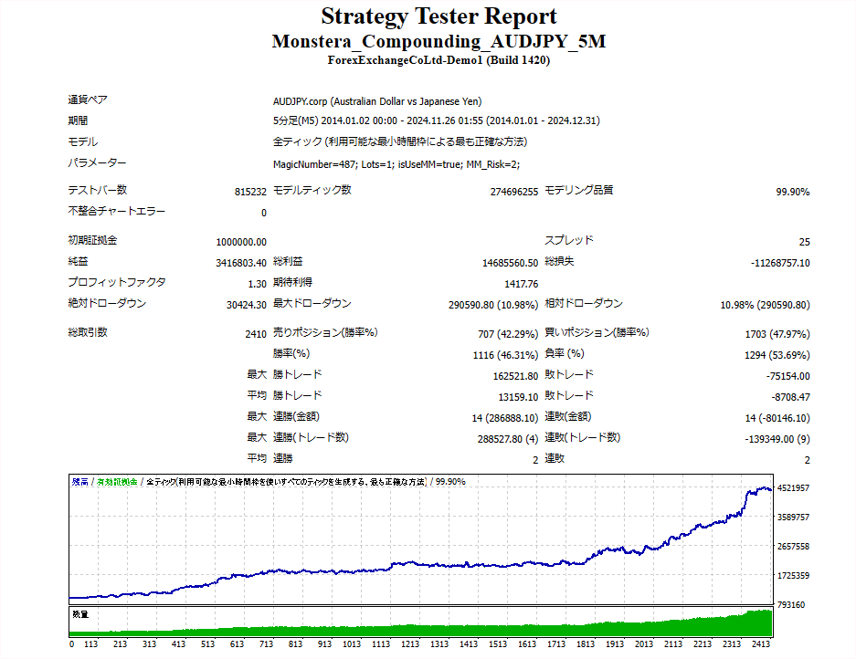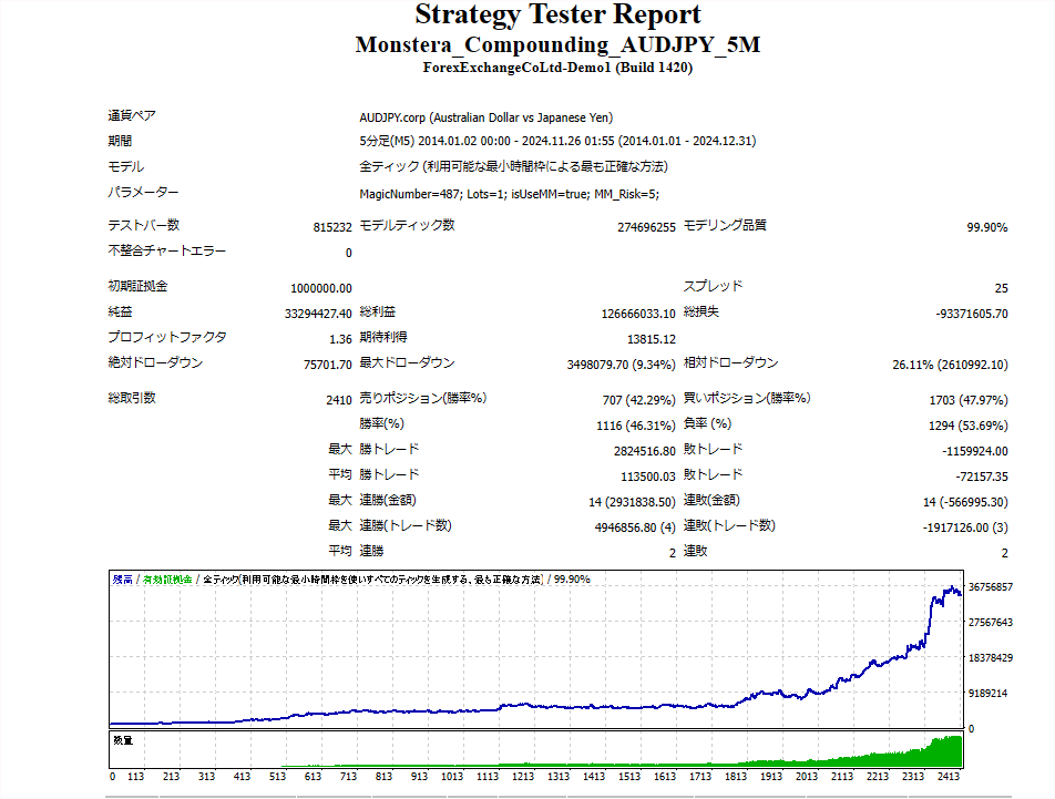 ただMonstera_Compounding_AUDJPY_5Mには週末決済機能は付いていないので、 週末にポジションを持ちたくない方は、手動で決済してください。 ::::::::::::::::::::::::::::::::::::::::::::::::::::::::::::::::::::::::::::::: Monstera_Compounding_AUDJPY_5Mのロジックは、 相場の短期的な動きに対して、 逆張りのエントリーチャンスを捉えることを目指しており、 チャンスが現れると上位足のトレンドを確認し、 トレンドが形成されている場合にエントリーを行います。 決済には指値注文とボリンジャーバンド・VQ・移動平均線・RSIなどのインジケーターを使用していて、 これらのインジケーターは価格の変動や相場の強弱を示す指標として活用しています。