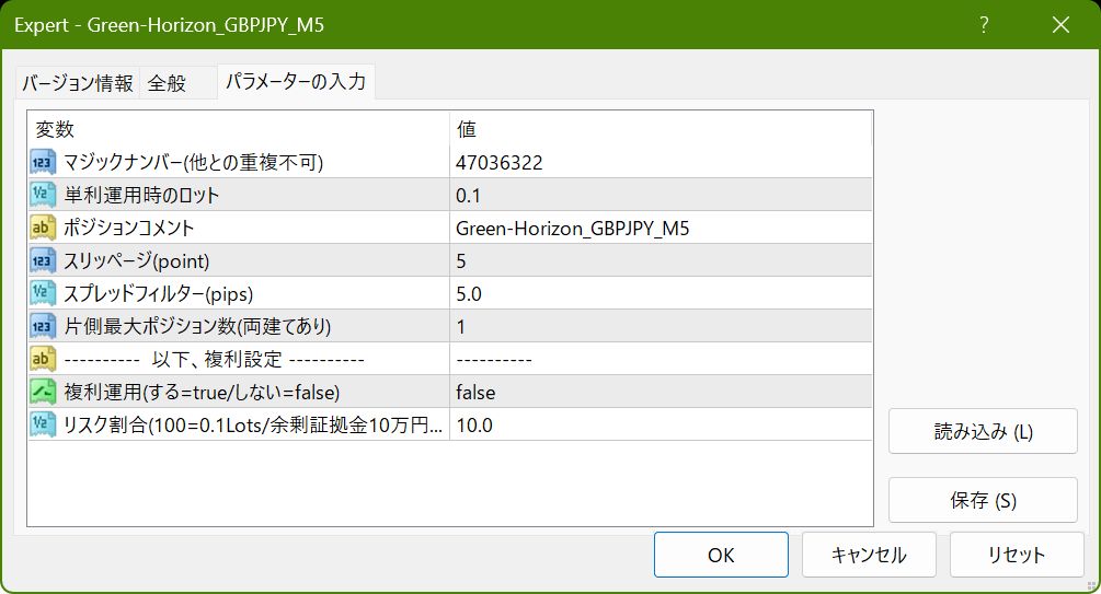 ・マジックナンバー / MagicNumber EAがポジションを識別するために使用する固有番号です。複数のEAを同じMT4で運用する際は、マジックナンバーが重複しないように設定してください。 ・単利運用時のロット / Lots 単利運用を行う際のロット数を設定します。バックテストの結果や最大ドローダウンを参考にして、無理のない範囲で設定してください。 複利運用時にはこの設定は使用されません。 ・ポジションコメント / Comment ポジションに付与するコメントを設定します。必要に応じて変更してください。 ・スリッページ / Slippage EAがポジションを取る際、指定した価格と実際の執行価格とで差異が生じることがあります。 許容できる範囲を指定します。 ・スプレッドフィルター / MaxSpread スプレッドがこの数値を越えている状況では新たなポジションを持ちません。