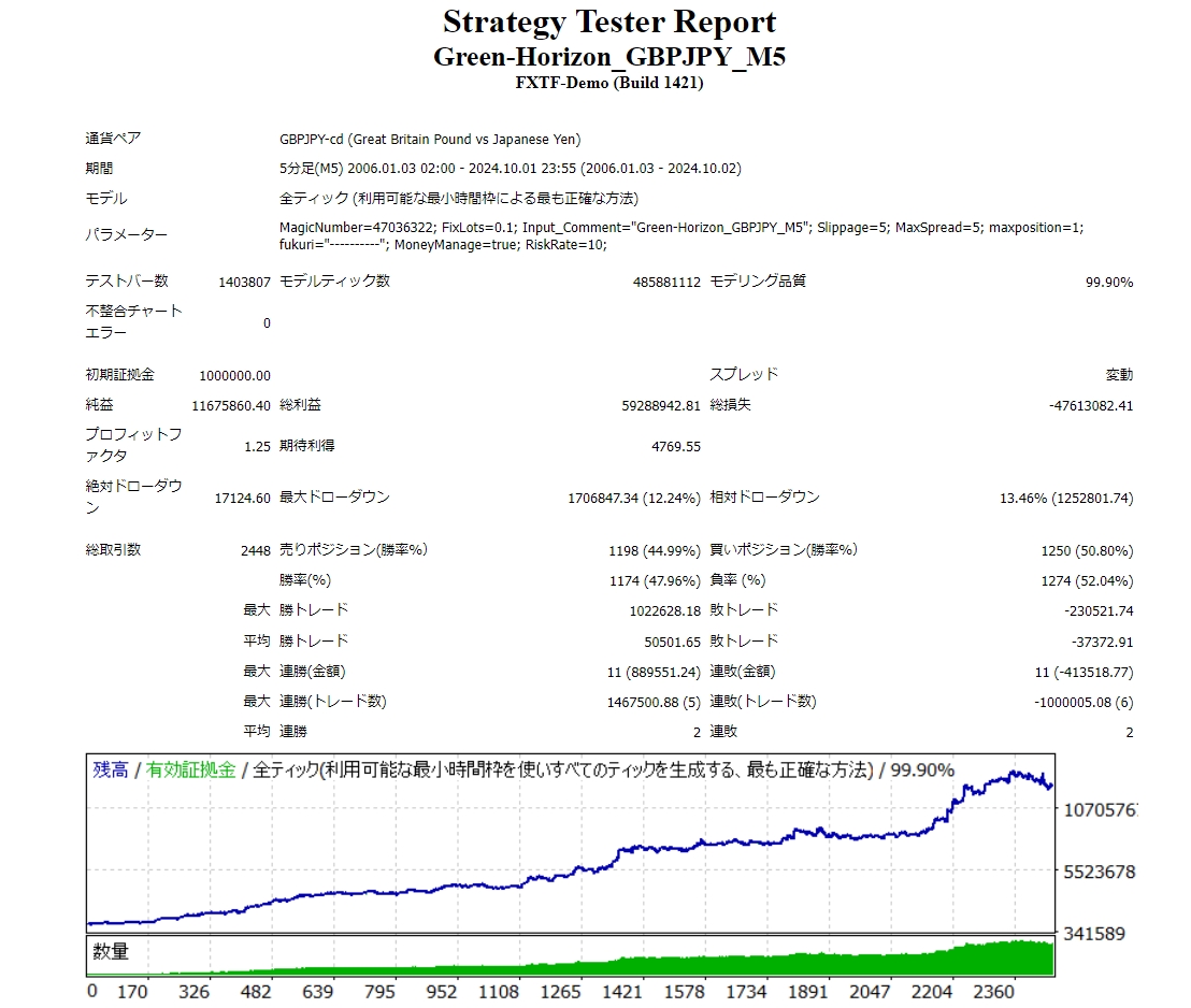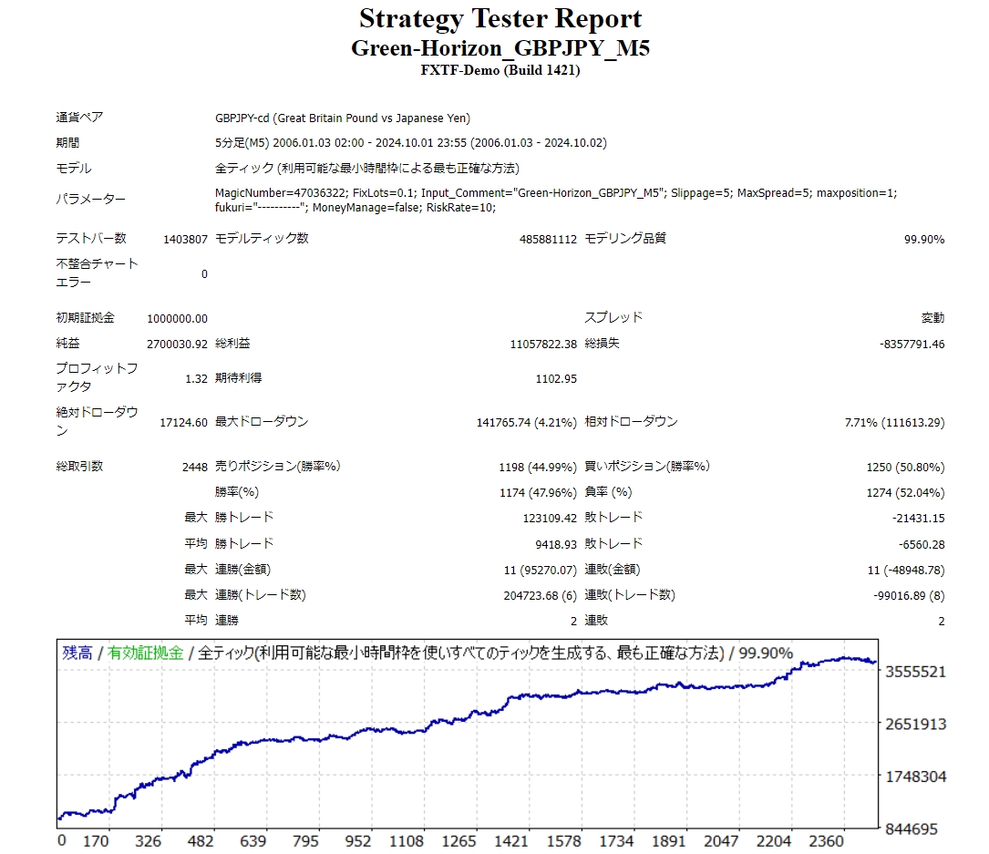 ボラティリティの高いポンド円(GBPJPY)に特化した「損小利大」タイプの自動売買ソフト(EA)です。大きな値動きを狙い、損失を抑えながら利益を最大化することを目的としています。 ・損小利大のロジックを搭載しており、損失を抑えつつ最大の利益を狙います。 ・複利機能を搭載で、利益を再投資しさらなる資産増加を狙います。 ・2006年からのデータを用いた最適化、モデリング品質の高いTick Data Suiteの変動スプレッドを使用してます。 ・GBPJPY M5に特化したEAのため、他の通貨ペアや時間足では動作しません。