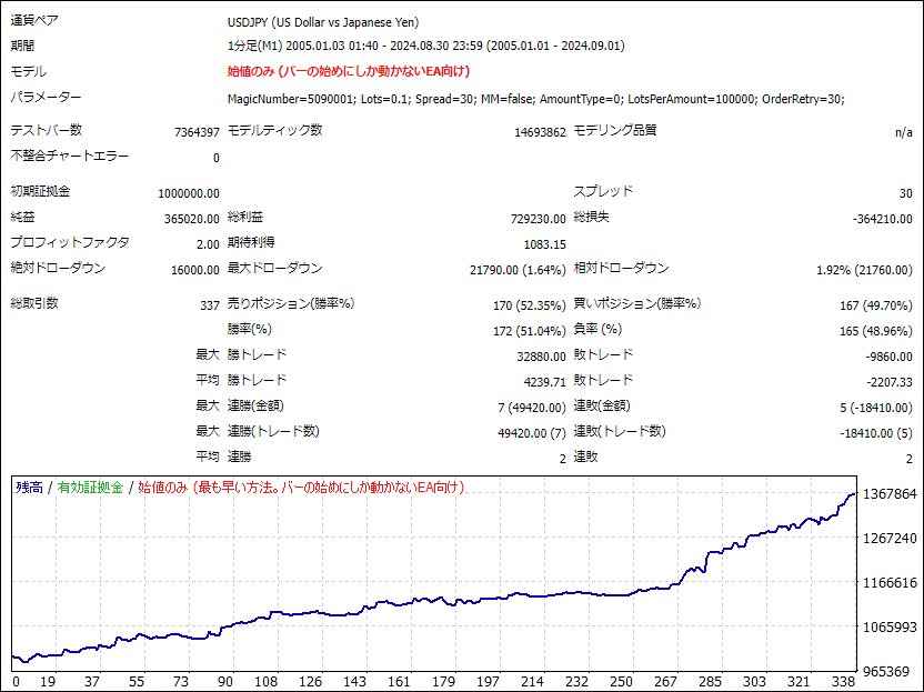 ※当EAは注文リトライ(バックテスト上で再現が困難)を除いて始値のみで動作するため「始値のみ」でテストしております。
