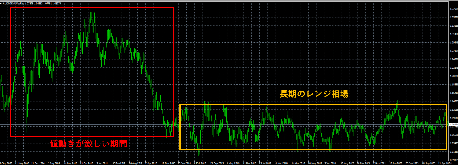 AUD/NZDは2014年以降長期のレンジ相場を形成しています。2013年以前は幅の広い上昇トレンドと下降トレンドが切り替わりながら激しく値動きする期間となっています。 それぞれの相場の特徴に応じたバックテストの結果を示します。