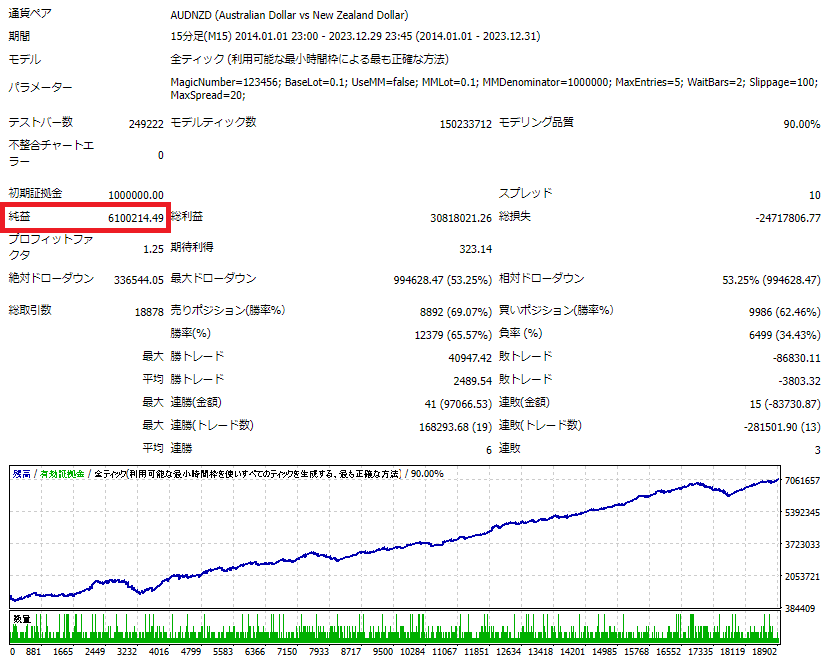AUD/NZDは2014年~2023年の相場で長期のレンジ相場を形成しています。この相場環境でのバックテスト結果を以下に示します。
