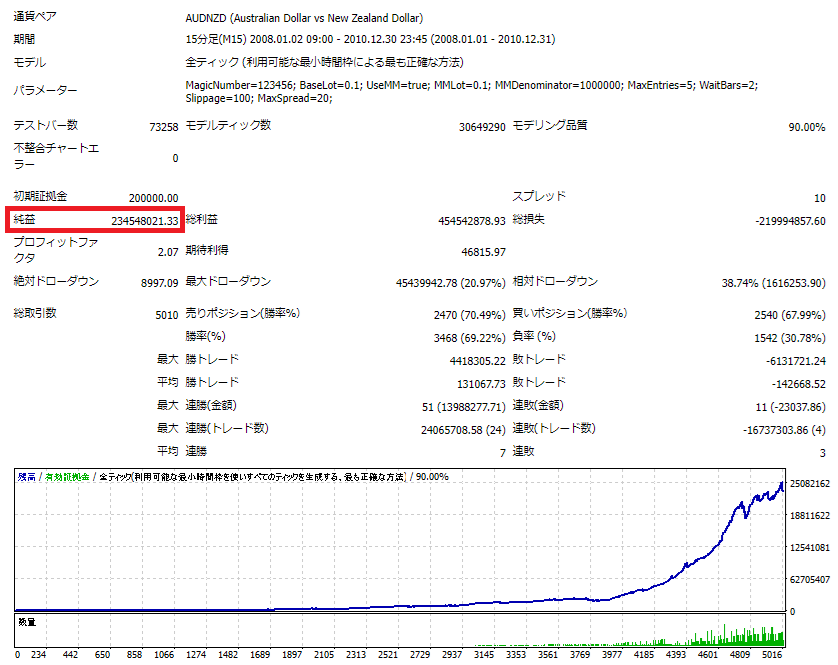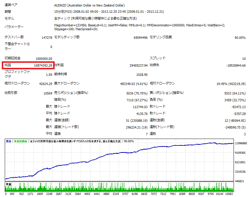 AUD/NZDが長期のレンジ相場を形成する以前の、値動きが激しい期間でのバックテスト結果を以下に示します。
