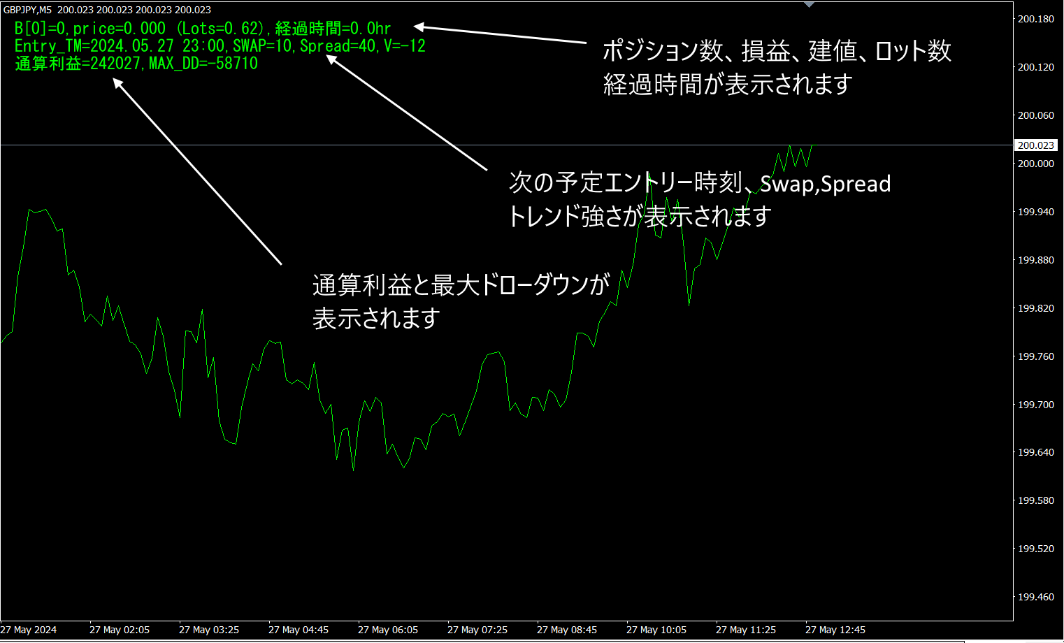 このEAは、GBPJPY専用で、Swapを狙うため、買いポジションを1ポジションしか建てません。しかも、サーバー時刻で日付が変わる少し前で、買い条件を満たした時のみ、ポジションを建てるので、エントリーの頻度は最大でも1日1回になります。実際には、月に23回程度のエントリー回数になります。GBPJPYのレートが下降している時は、新規のポジションを建てないようしています。