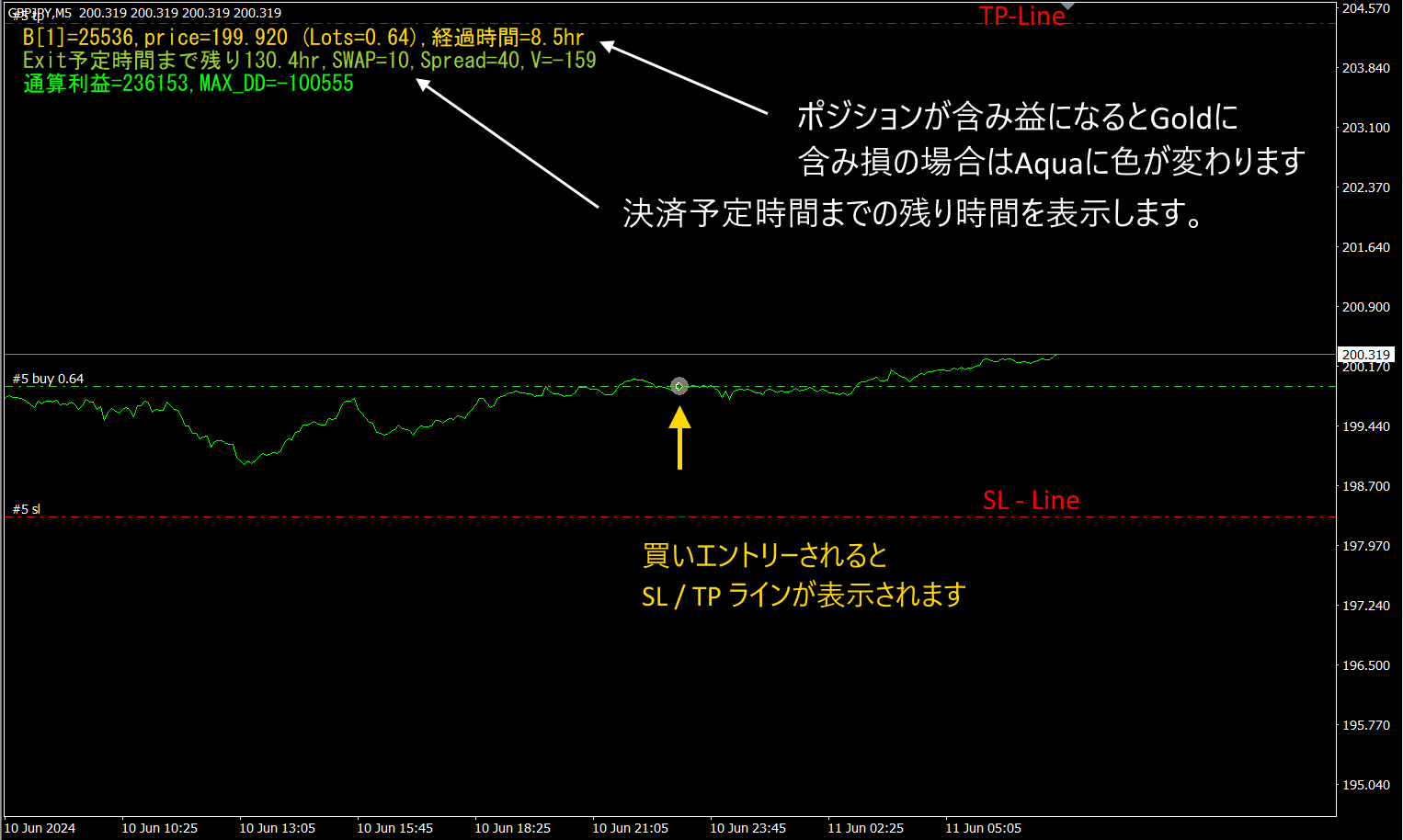 ・SL (Stop Loss): The set maximum loss pips (or specified amount, etc.) in the EA's settings