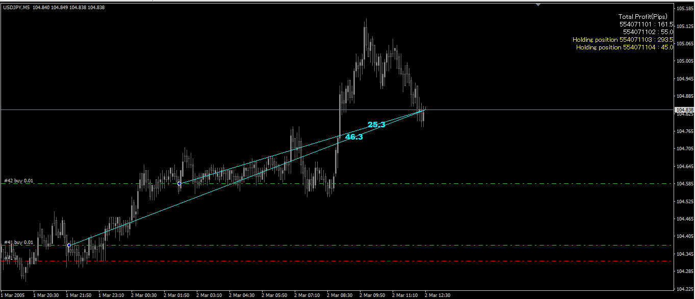 【チャートの説明】 本EAでは、チャート右上に各マジックナンバーごとの総獲得Pipsが表示されています。また、保有中のロジックは文字が黄色に変化し、チャート上にも現在の損益Pipsを表示するような設定となっています。 ※損益Pipsは計算負荷を減らすため、5分ごとの始値動作以降の更新となっています。