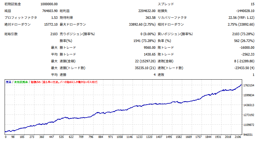 本EAはLongエントリーのみですが、 バックテスト自体は2005年から直近までの期間で行っており、 2008年のリーマンショック以降から2011年の頃までに 110円台から70円台までに円高になりましたが、 それでもバックテスト上では右肩上がりになっています。