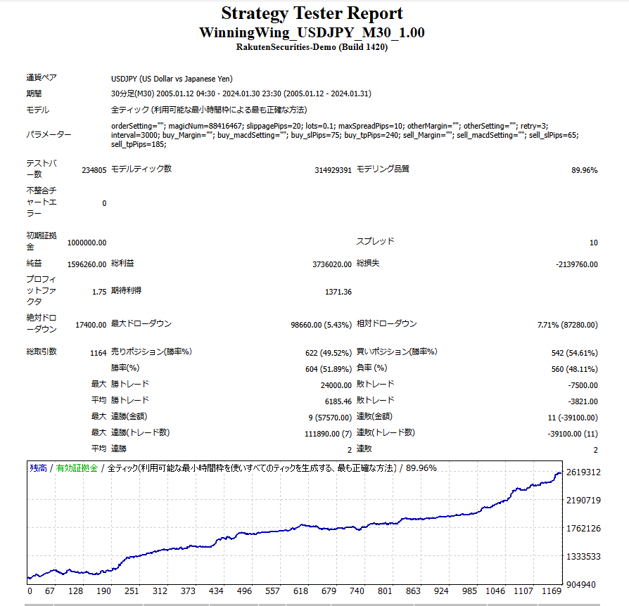 ・計測期間:2005.01.12 04:30 - 2024.01.30(約19年) ・PF(プロフィットファクター):1.75 ・期待利得:1371.36 ・最大ドローダウン:5.43% ・勝率:51.89% ・勝トレード平均: 6185.46(円) ・敗トレード平均:-3821.00(円)