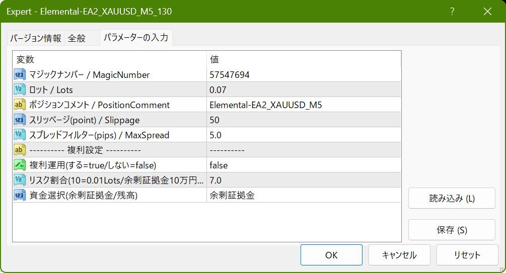 ・マジックナンバー / MagicNumber EAがポジションを識別するために使用する固有番号です。複数のEAを同じMT4で運用する際は、マジックナンバーが重複しないように設定してください。 ・ロット / Lots 単利運用を行う際のロット数を設定します。バックテストの結果や最大ドローダウンを参考にして、無理のない範囲で設定してください。 複利運用時にはこの設定は使用されません。 ・ポジションコメント / Comment ポジションに付与するコメントを設定します。必要に応じて変更してください。 ・スリッページ / Slippage EAがポジションを取る際、指定した価格と実際の執行価格とで差異が生じることがあります。 許容できる範囲を指定します。 ・スプレッドフィルター / MaxSpread スプレッドがこの数値を越えている状況では新たなポジションを持ちません。