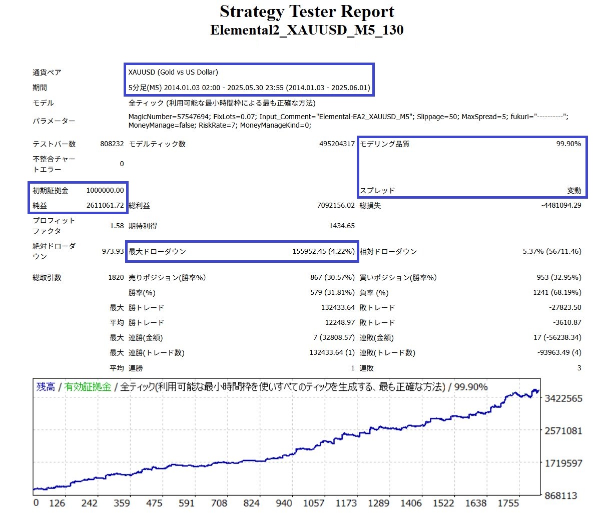 デフォルト設定、初期証拠金100万円でロット0.07、最大DD約15.6万円(相対DD 5.37%)、純益約261万円