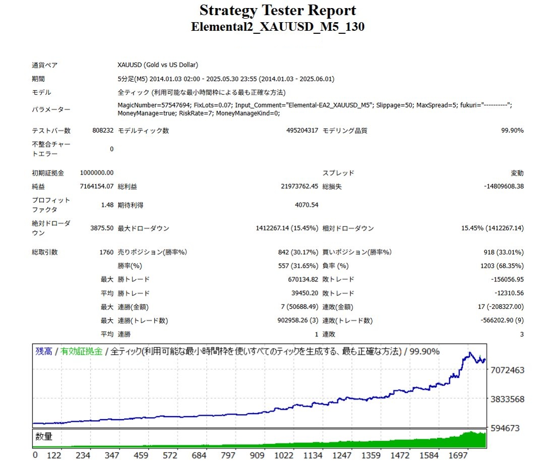 ゴールド(XAUUSD)のトレードは、その値動きの激しさで知られています。瞬時に大きな値幅が生じるため、チャンスとリスクが隣り合わせです。そんなマーケットにおいて、効率的に利益を追求できるEAを目指しました。 ・MAやローソク足の動きを利用した損小利大のロジックを搭載しており、損失を抑えつつ最大の利益を狙います。 ・複利機能を搭載で、利益を再投資しさらなる資産増加を狙います。 ・直近10年のデータを用いた最適化、モデリング品質の高いTick Data Suiteの変動スプレッドを使用してます。 ・XAUUSD M5専用のEAです。XAUUSDの取り扱いについてはブローカーにご確認ください。