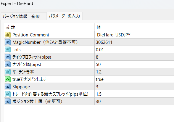 Increasing the lot size forcibly due to a high winning rate can, in rare instances, depending on the EA, lead to substantial Pips loss when a loss occurs. It is crucial to verify the SL Pips and the number of positions held before operating with an appropriate lot.