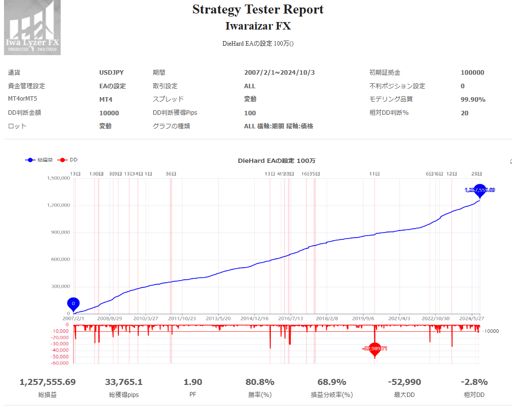 最大保持ポジションが14ポジ、Lots0.01運用の場合には最大Lots0.53、最大DD17万6400円(これは2007年からでの最大の含み損で損失ではありません)単独決済でも合算決済でも損失はありません。