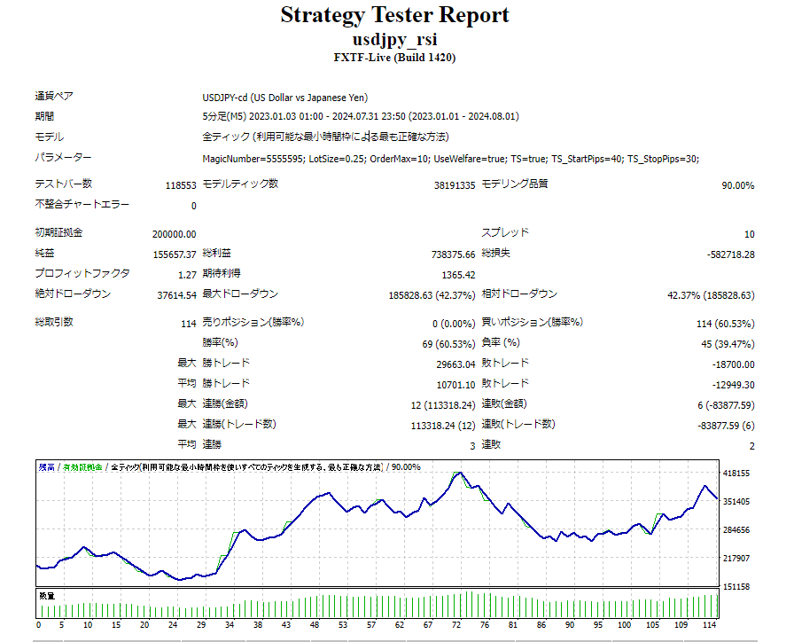 直近の1年半(2023年1月1日から2024年7月31日まで)動作させた場合のバックテストを添付いたします。