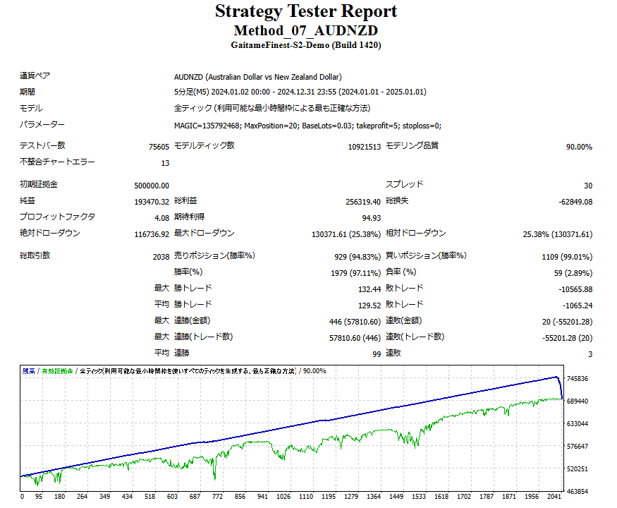 こちらは2024.1.1~2025.1.1のバックテストとなります1年間で約20万円の利益となります