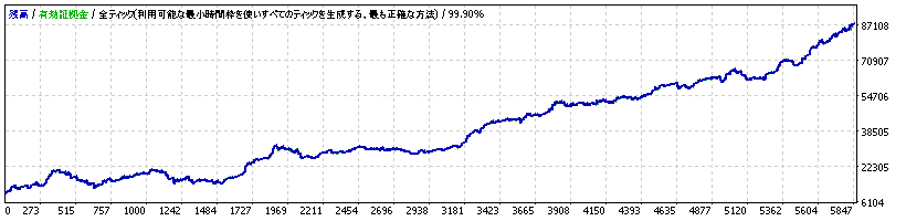 このテストでは利確値幅が小さいスキャルピングEA等では結果が悪くなってしまいますが、本EAではこのテストでも右肩上がりになっておりロジックの優位性が大きいことが分かります。