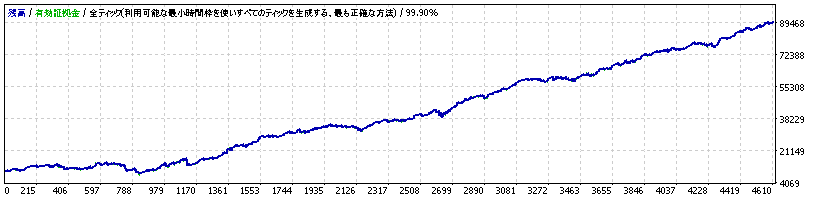 このテストでは利確値幅が小さいスキャルピングEA等では結果が悪くなってしまいますが、本EAではこのテストでも右肩上がりになっておりロジックの優位性が大きいことが分かります。