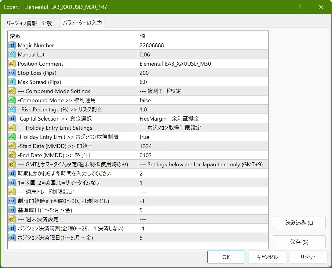 --- 週末トレード制御の説明 --- 金曜日の指定時刻以降、次週の市場オープンまでエントリーを制限します。 こちらの設定は日本時間で入力してください。 ・エントリー制限開始時刻(0-23:金曜 24-30:土曜 -1:制限なし) デフォルトは-1(制限無し) --- 週末決済設定 --- 金曜日の指定時刻に既存ポジションを決済します。次週の市場オープンまでエントリーも制限します。 ・ポジション決済時刻(0-23:金曜 24-28:土曜 -1:決済しない) デフォルトは-1(決済無し) (重要)EAが動作していない場合や、取引時間外の場合等は機能しません。 ブローカー毎に取引時間は違います。特に年末はご注意ください。
