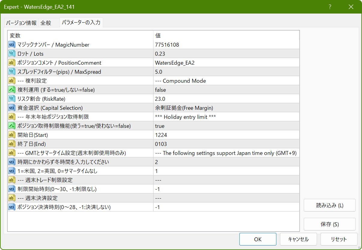 --- 年末年始ポジション取得制限の説明 --- ポジションの取得を制限します。決済はしません。 日時は半角で入力(例:1224、0103等)してください。 ・ポジション取得制限(デフォルトでtrueです、使わない場合はfalse) ・開始日(Start) 開始日のサーバー時間0:00よりスキップします。 ・終了日(End) 開始日以降の日付として認識します。 終了日のサーバー時間23:59でスキップが終了します。 ※ポジションの決済はしません。確実に決済したい場合はEAを停止して手動で決済してください。 --- 週末トレード制御の説明 --- 金曜日の指定時刻以降、次週の市場オープンまでエントリーを制限します。 こちらの設定は日本時間で入力してください。 ・エントリー制限開始時刻(0-23:金曜 24-30:土曜 -1:制限なし) デフォルトは-1(制限無し) --- 週末決済設定 --- 金曜日の指定時刻に既存ポジションを決済します。次週の市場オープンまでエントリーも制限します。 ・ポジション決済時刻(0-23:金曜 24-28:土曜 -1:決済しない) デフォルトは-1(決済無し) (重要)EAが動作していない場合や、取引時間外の場合等は機能しません。 ブローカー毎に取引時間は違います。特に年末はご注意ください。