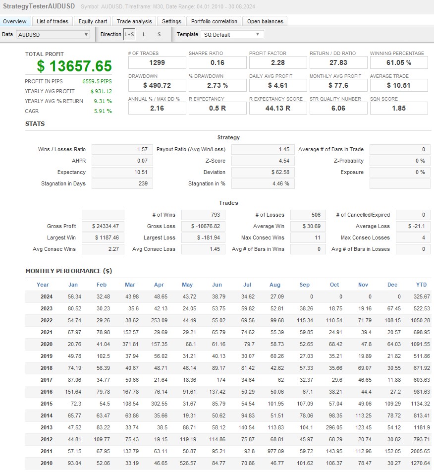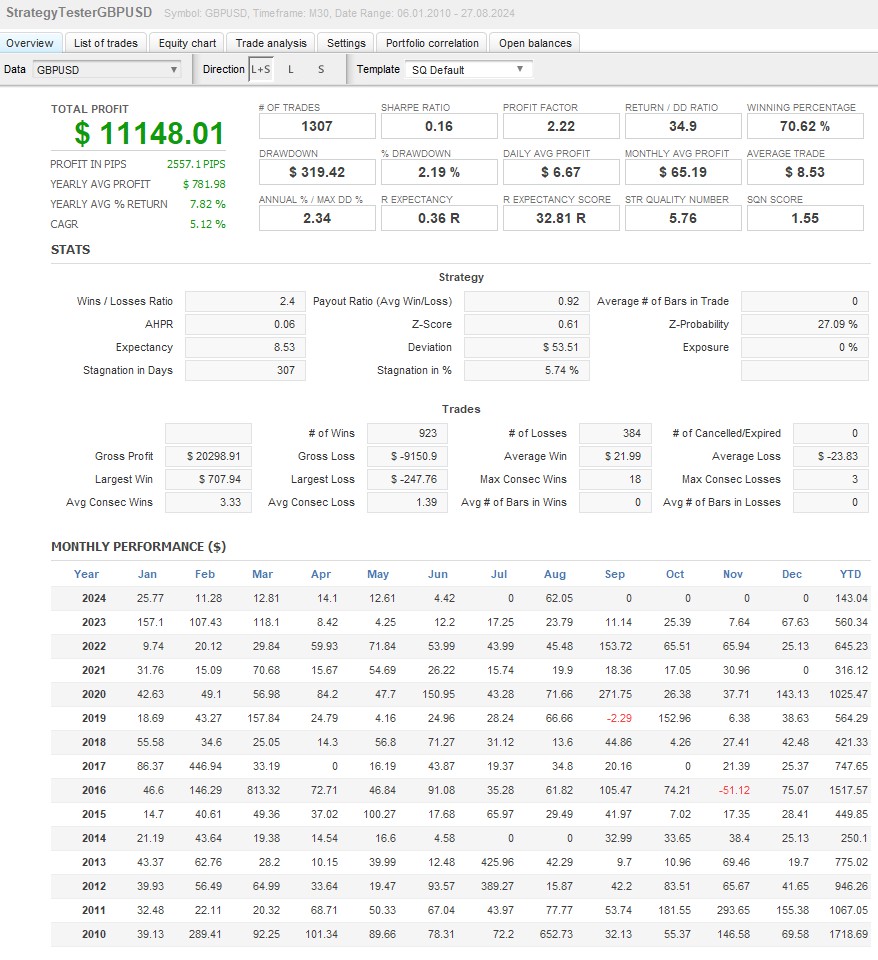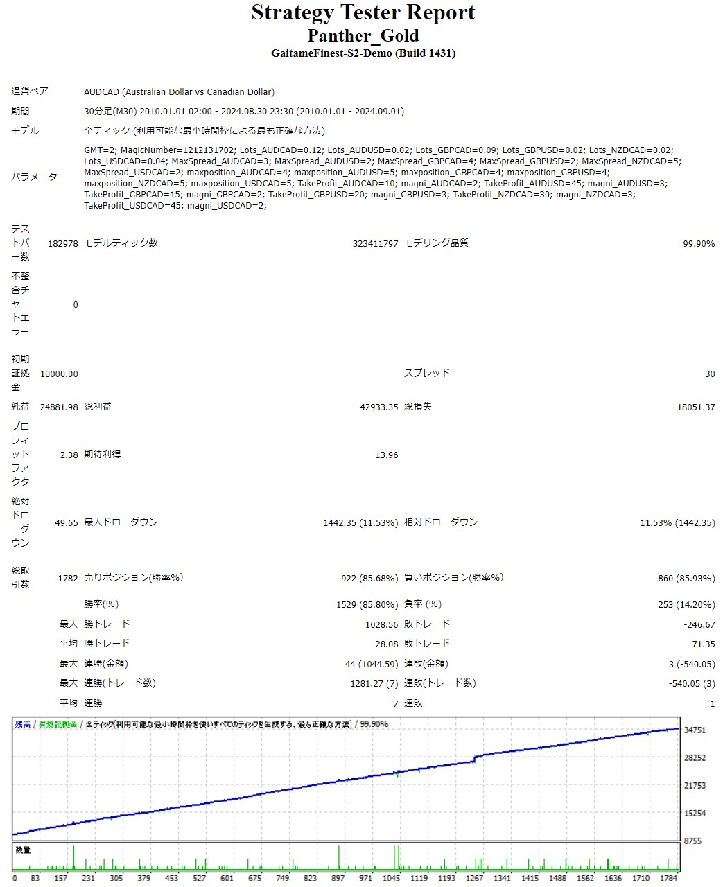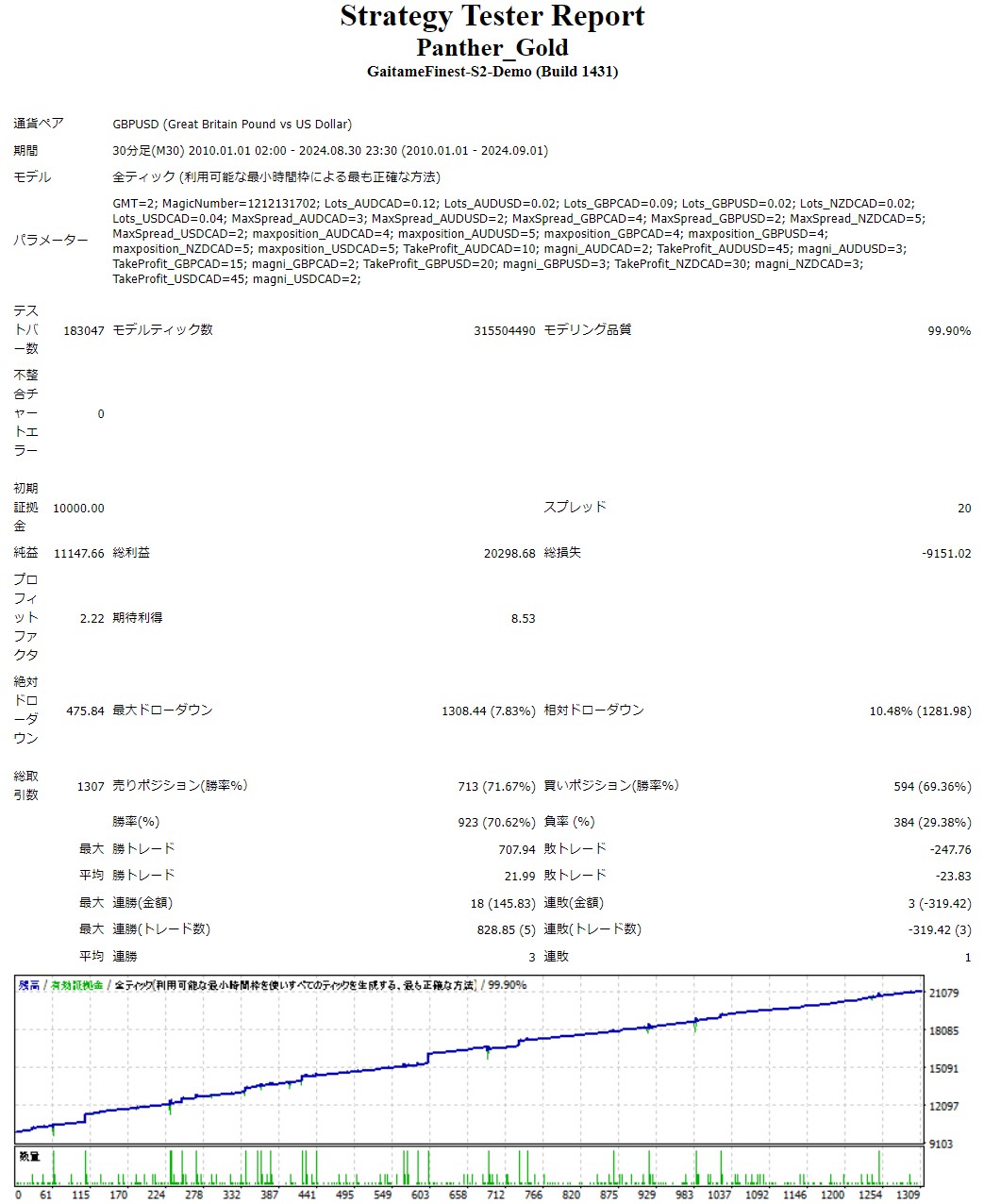 Quant Analyzerを使用し、ポートフォリオ運用全体のパフォーマンスを分析。複数通貨での分散効果により、安定した収益性が証明されました。