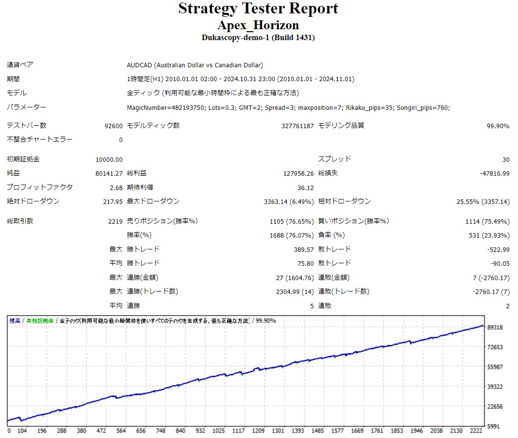 この度ご紹介するApex_Horizon_H1_AUDCADは、安定したパフォーマンスとリスク管理を重視したトレードシステムです。 シンプルで使いやすい設計を追求し、初心者の方から経験豊富なトレーダーまで幅広くご活用いただける内容となっております。